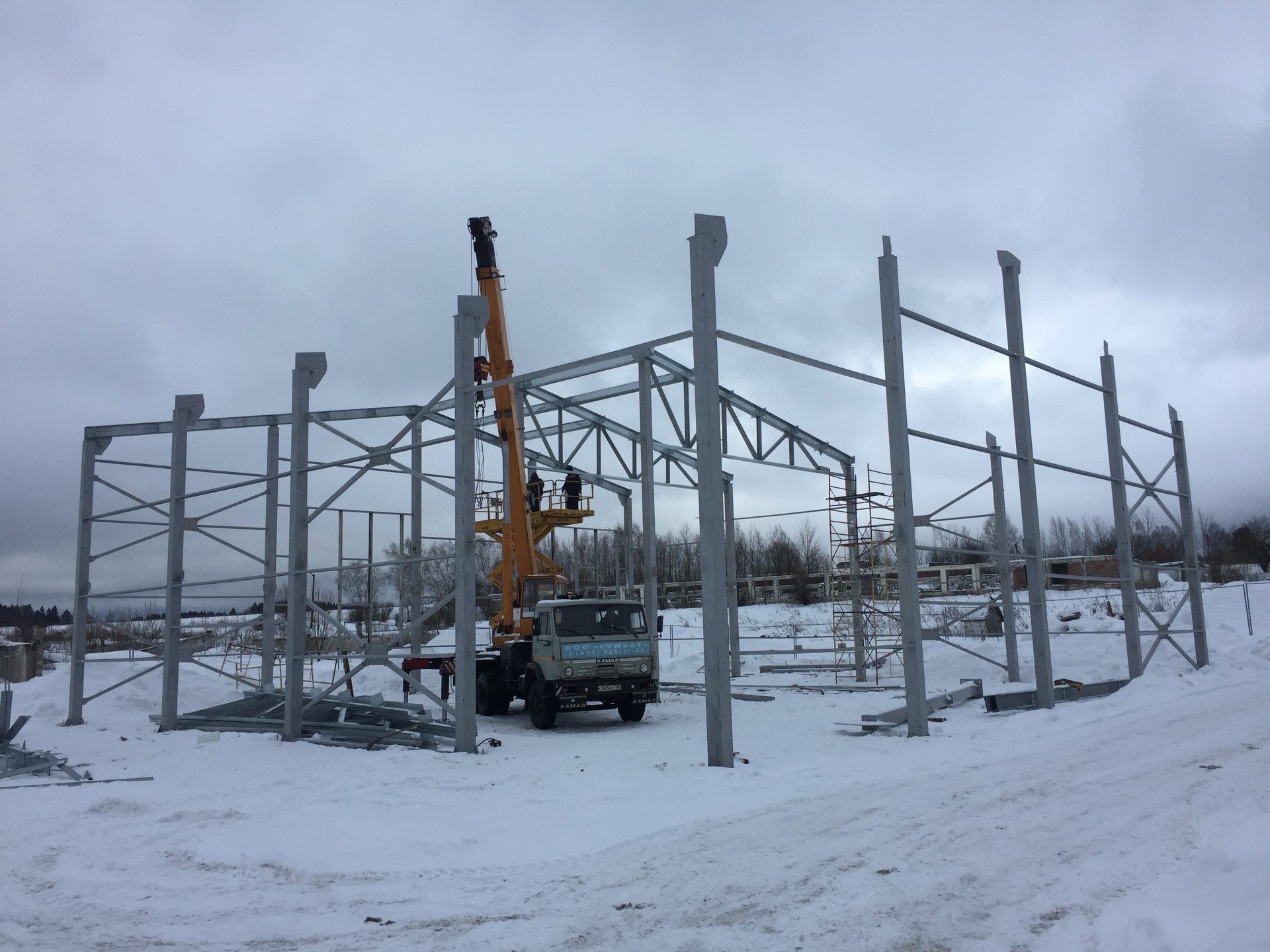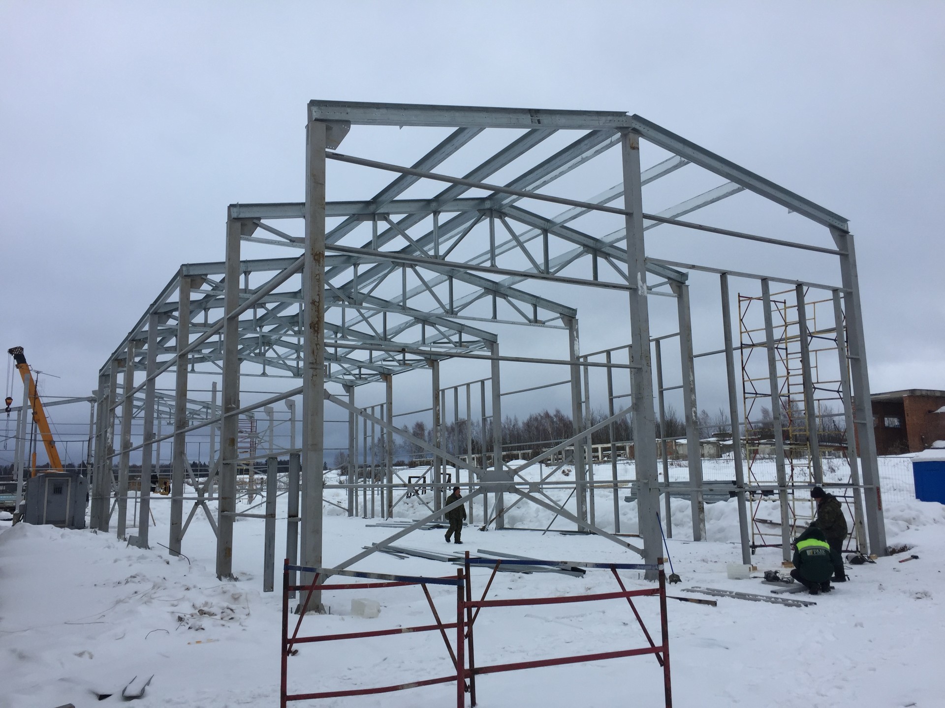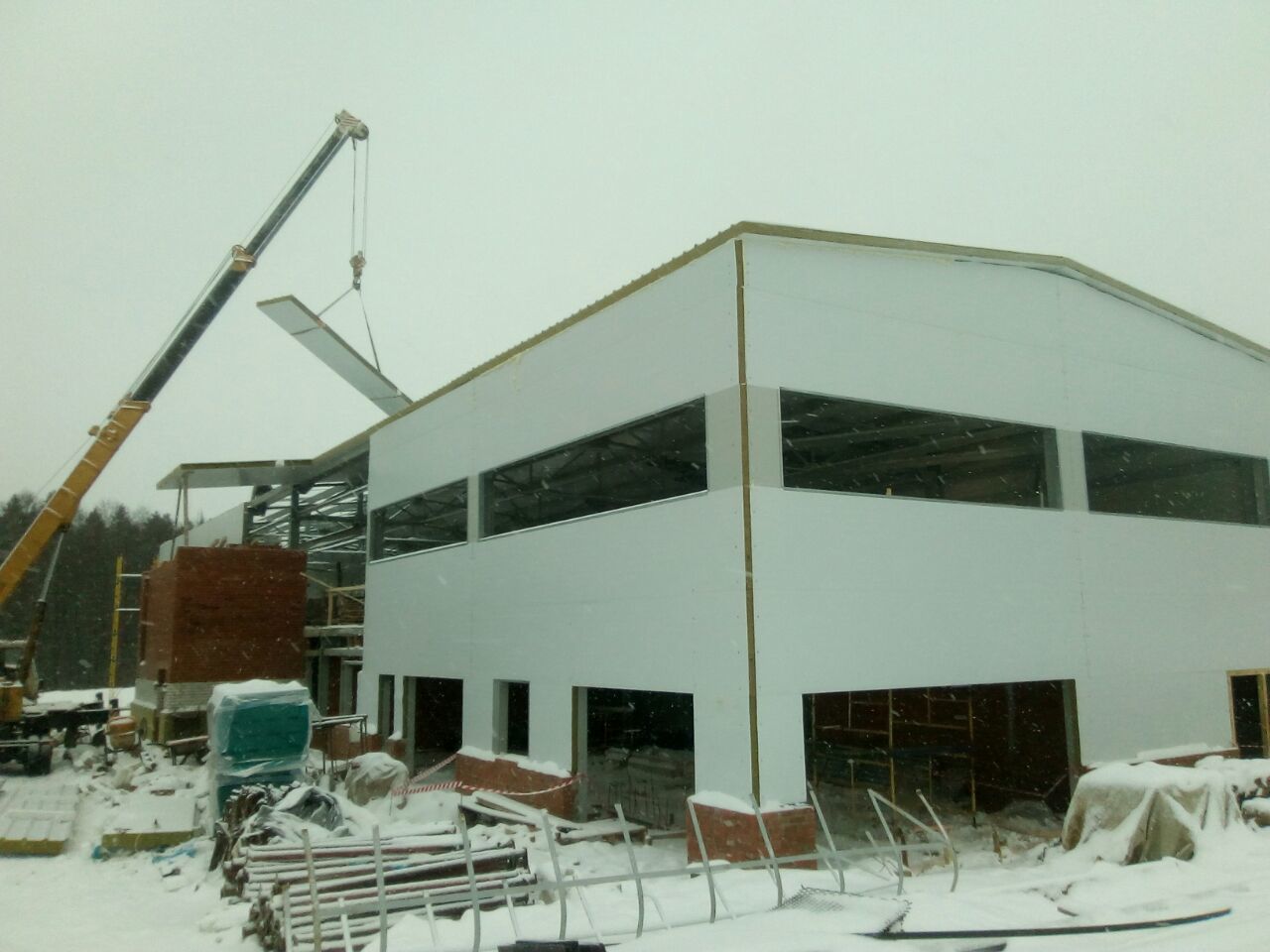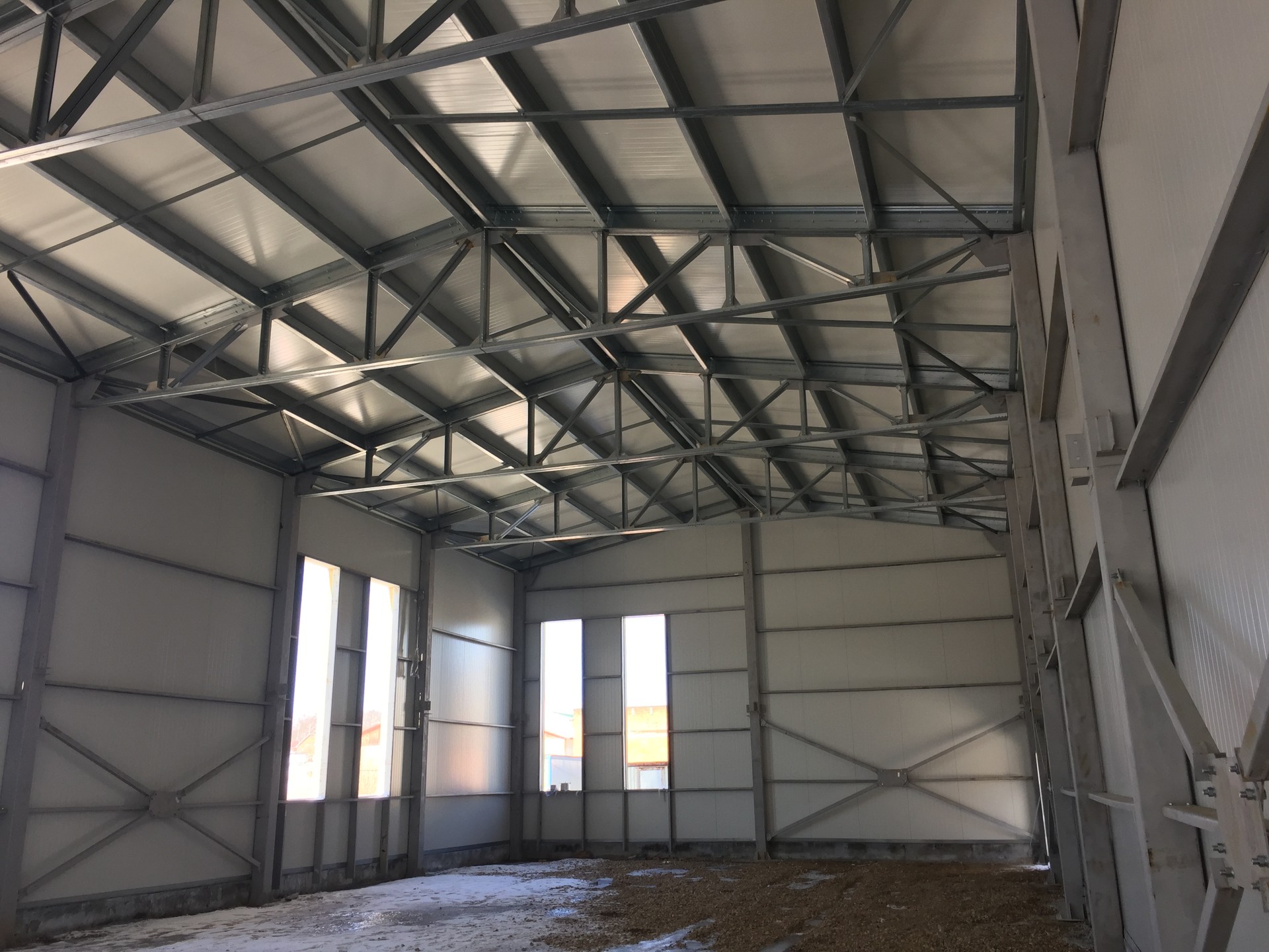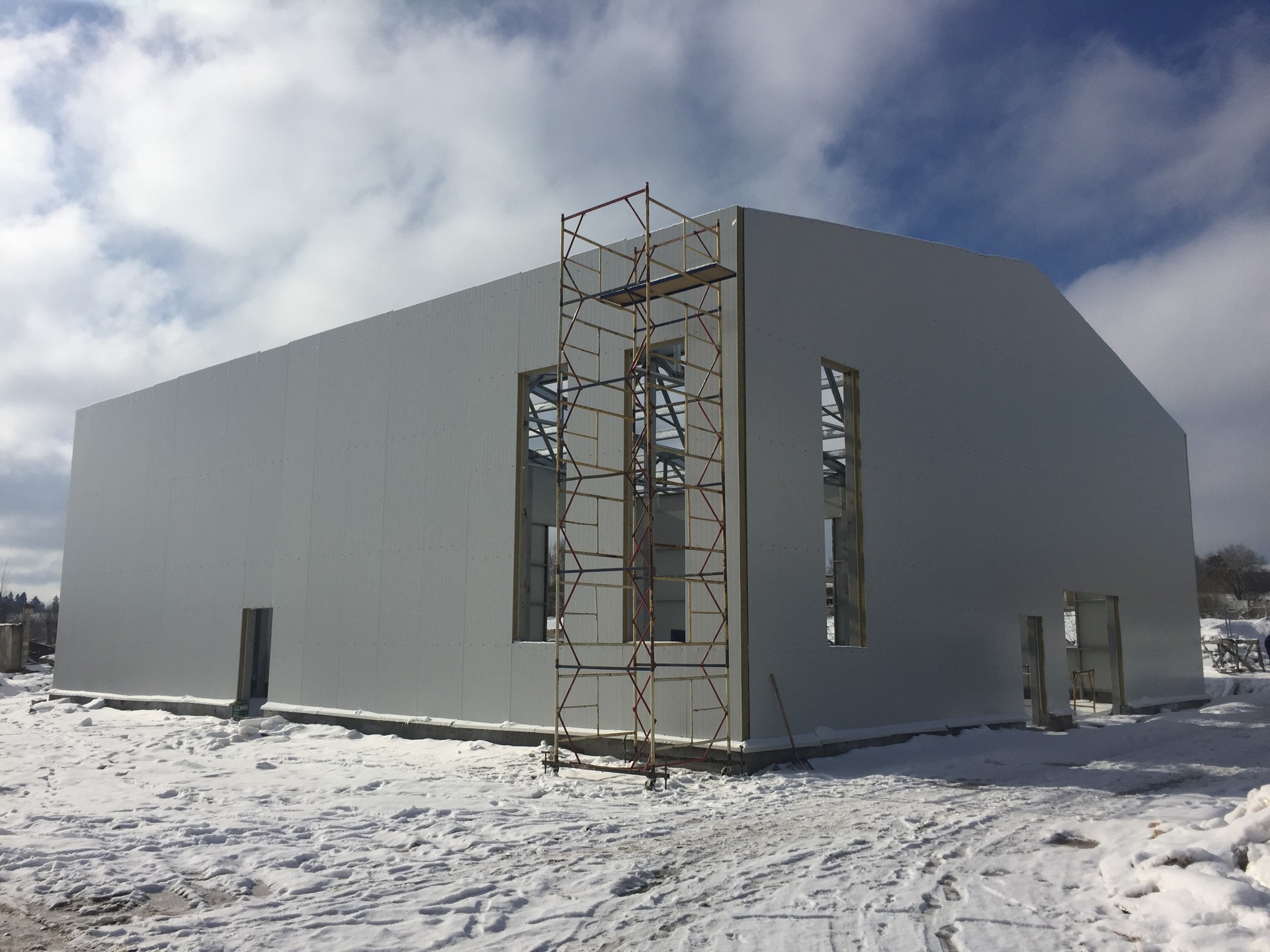 Что сделали: Монтаж металлоконструкций, монтаж сэндвич-панелей, монтаж окон, ворот и дверей.