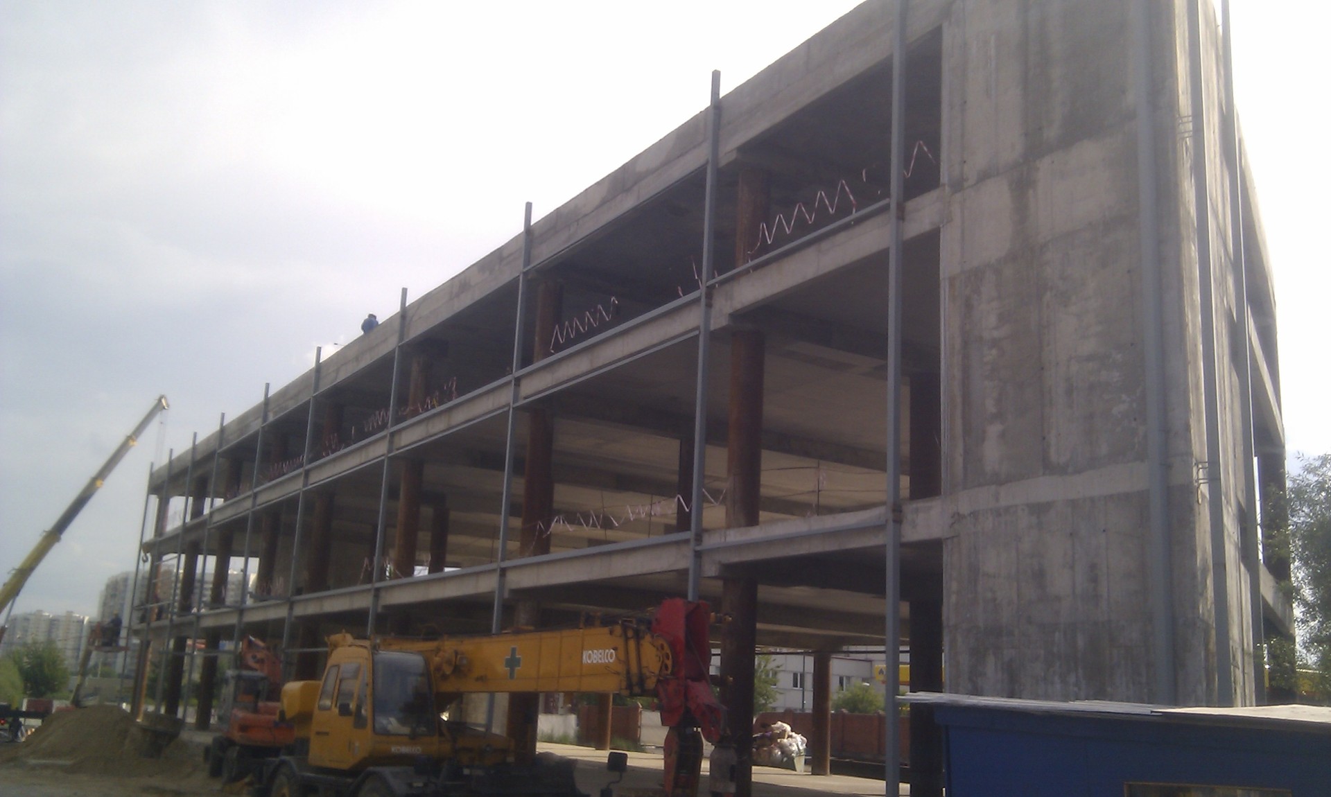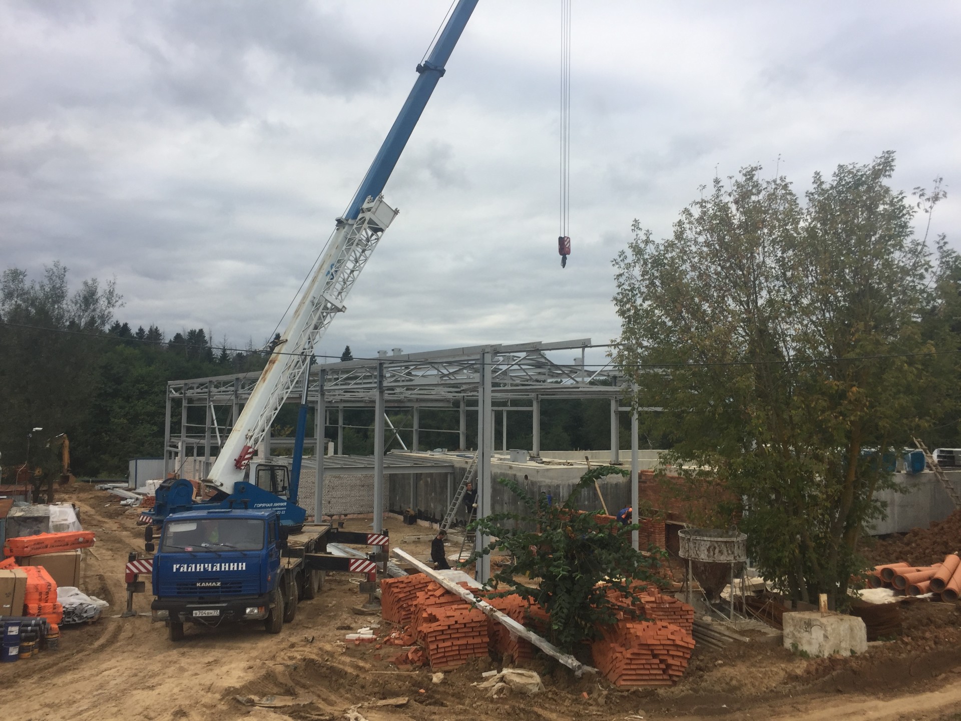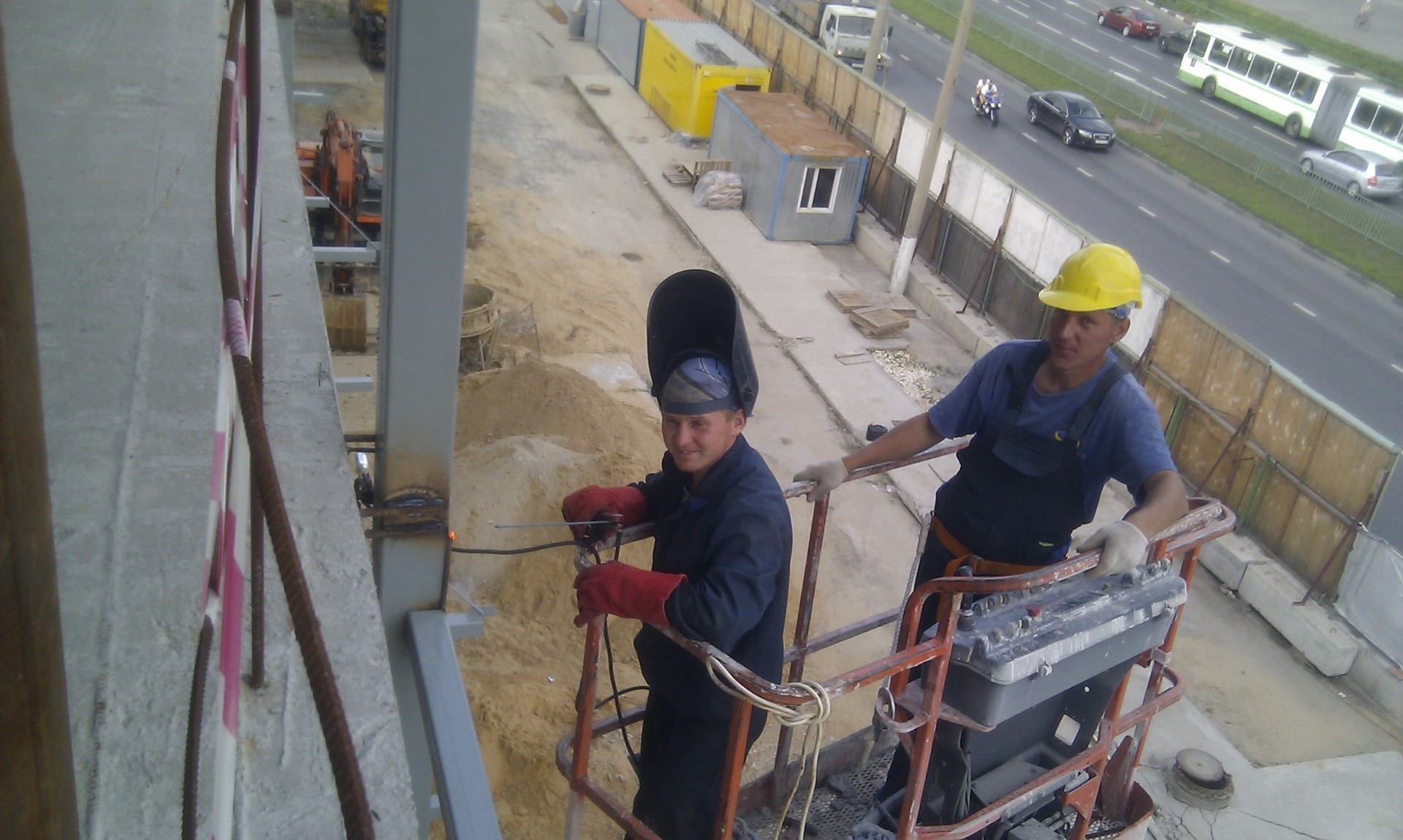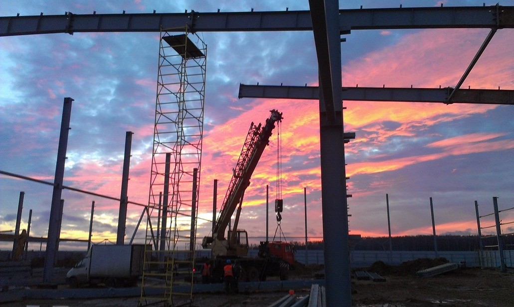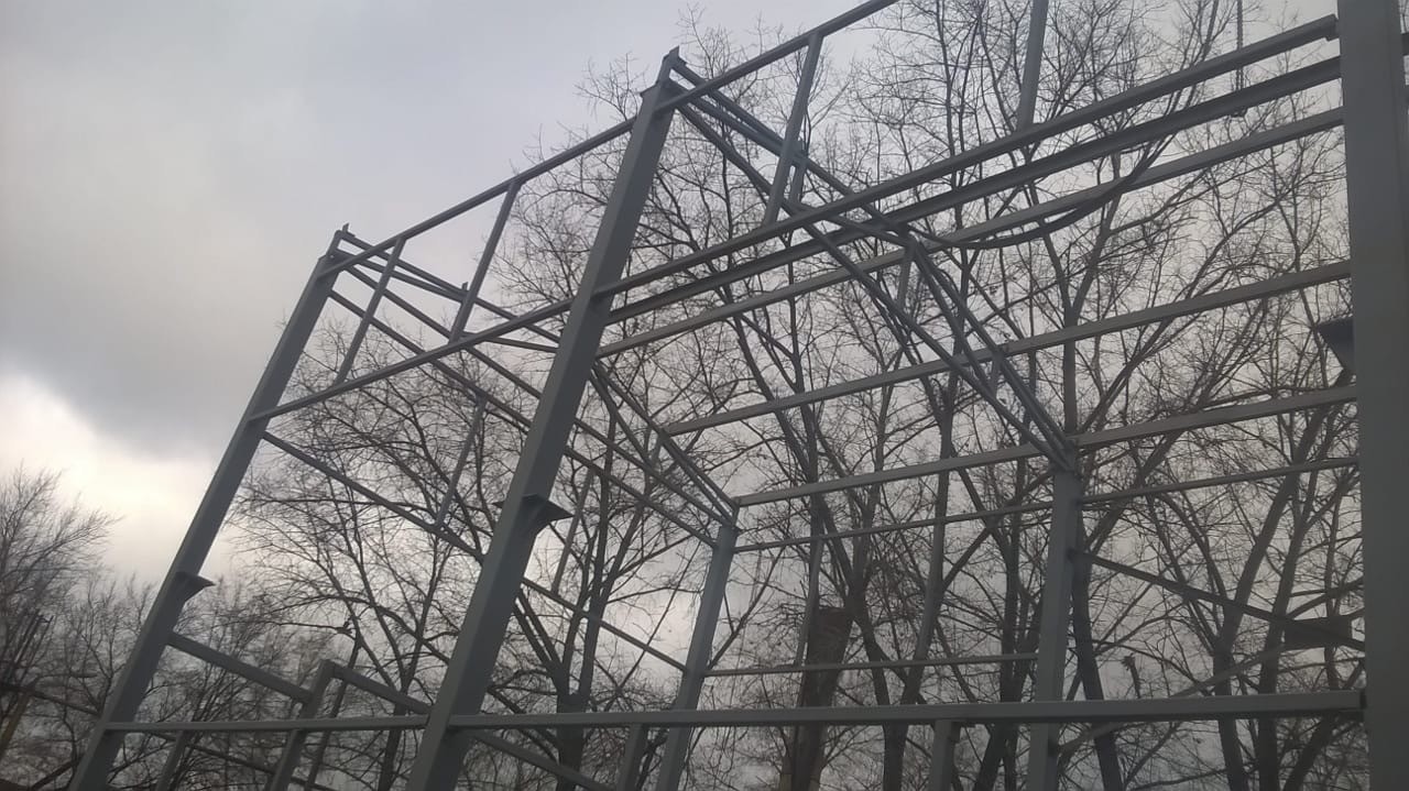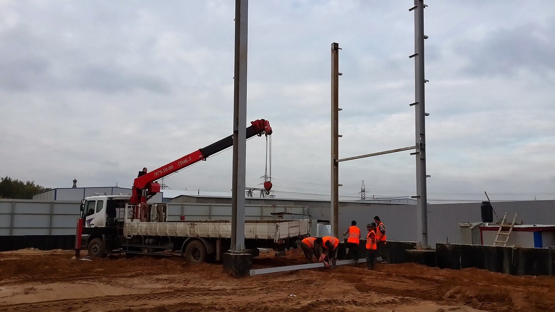 12.После установки анкерных блоков, начинается монтаж металлоконструкций. Все металлоконструкции заводского изготовления, монтаж на болтовых соединениях. Монтаж ведется с использованием грузоподъемной техники с соблюдением всех требований безопасности. Монтажники имеют допуск к высотным работам.