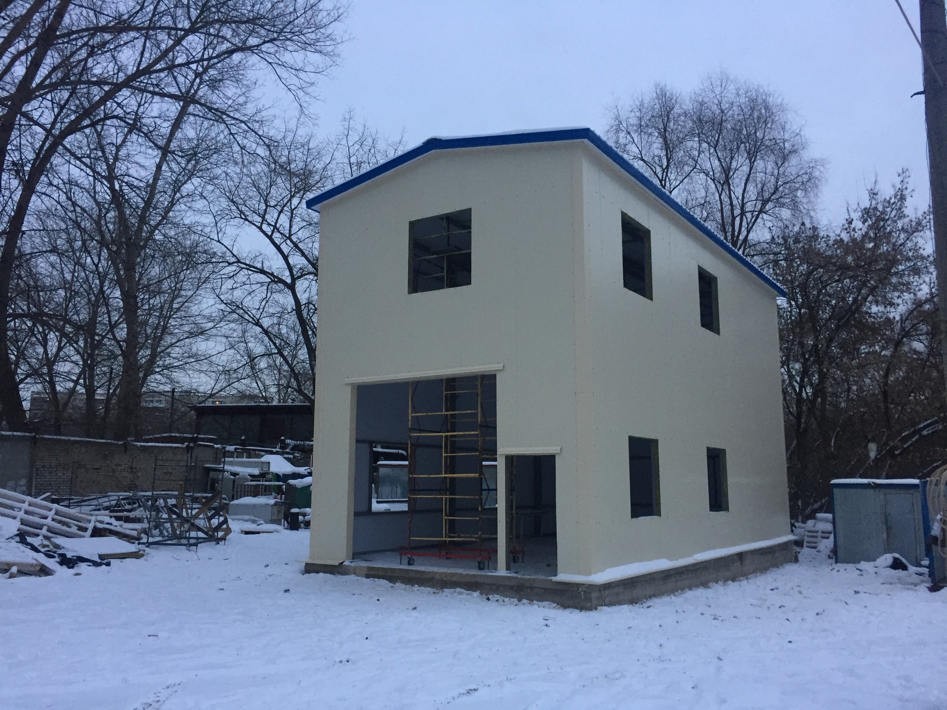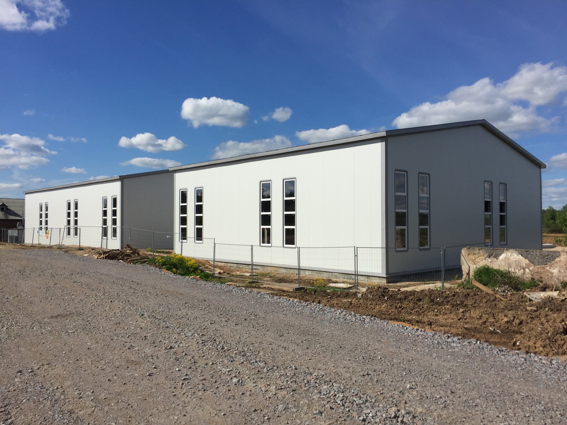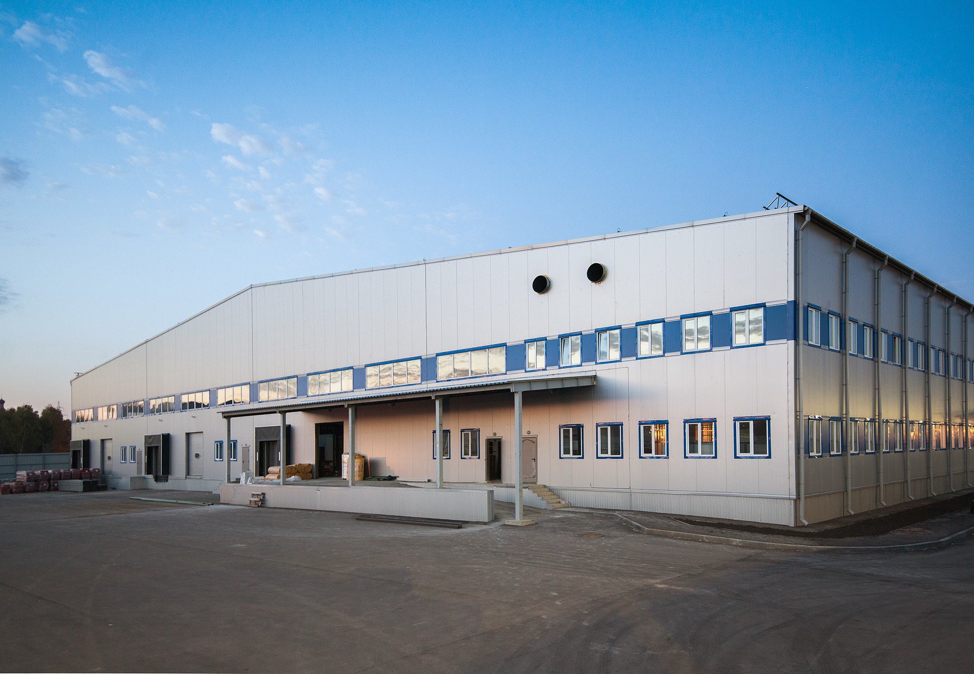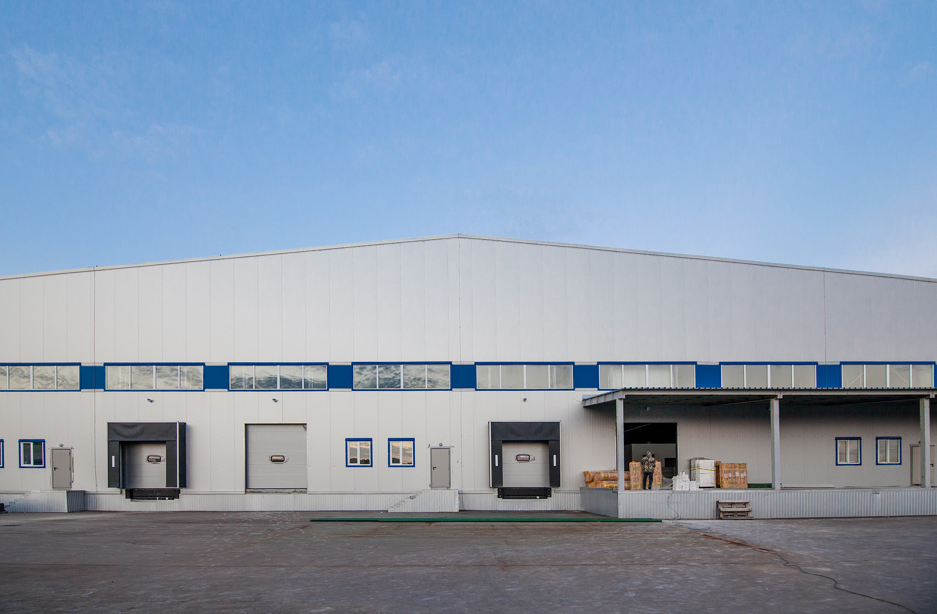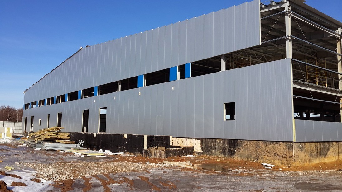 Что сделали: Проектирование и устройство несущей конструкции фахверка, монтаж сэндвич-панелей, монтаж входных групп, дверей и ворота, остекления.