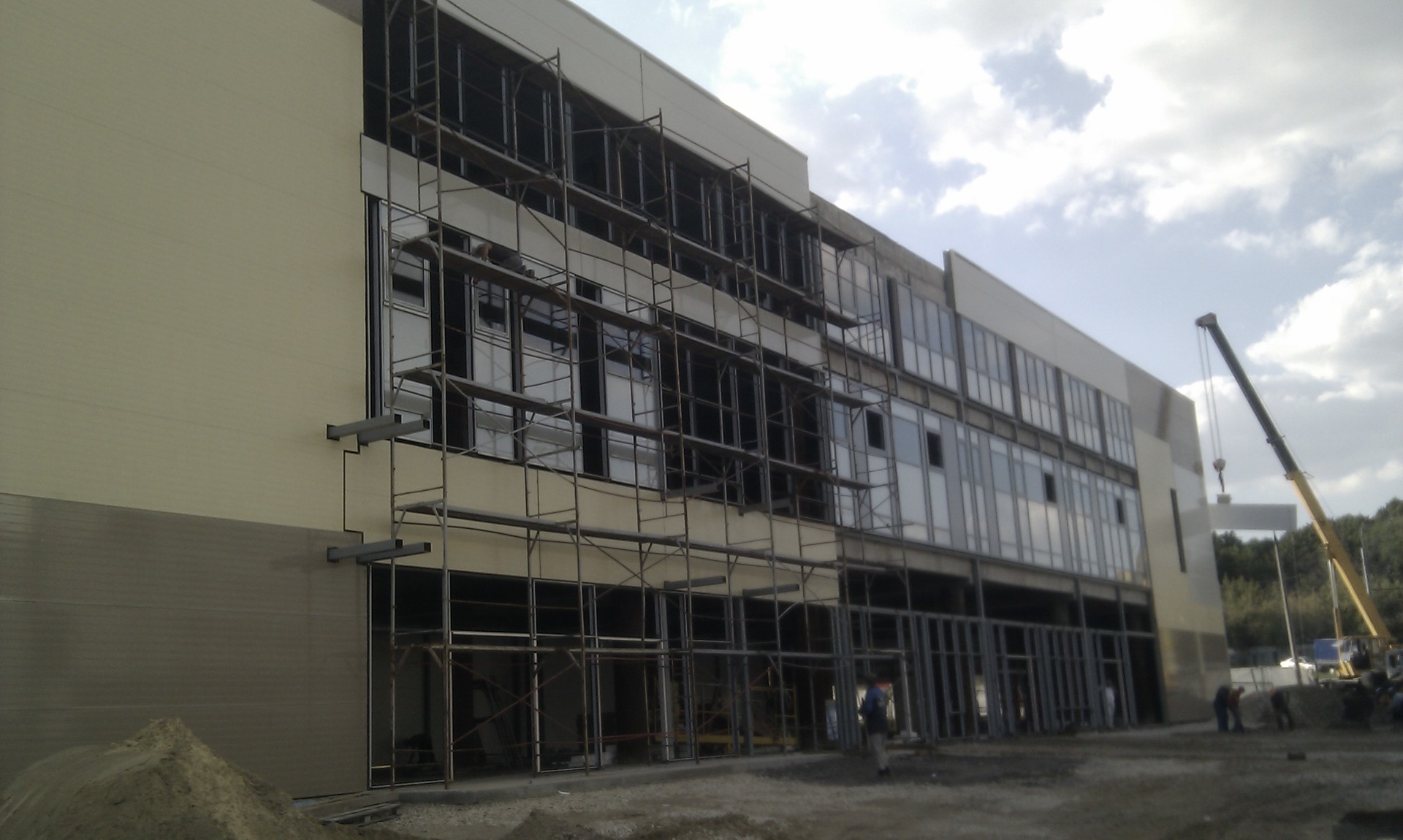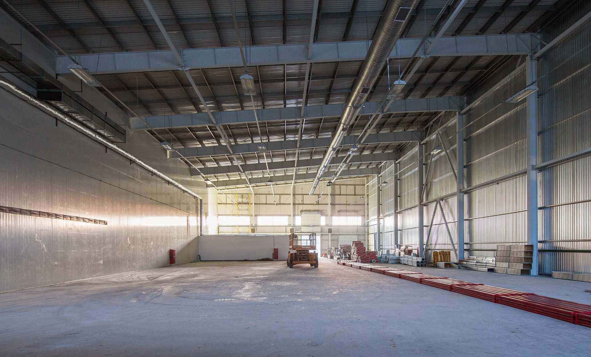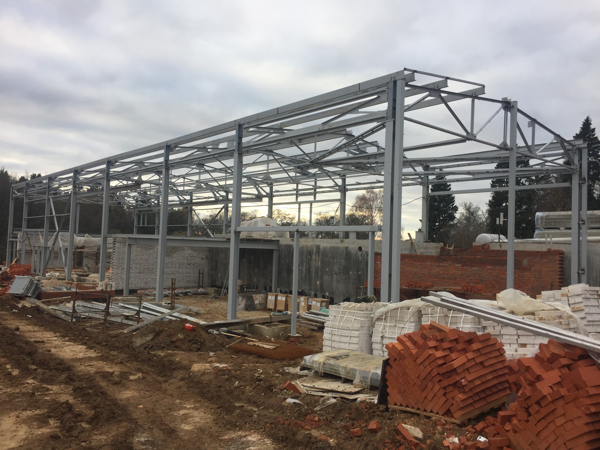 Что сделали: Монтаж металлоконструкций, монтаж сэндвич-панелей, монтаж окон, ворот и дверей, устройство внутренних перекрытий, устройство входной группы, кирпичная кладка, устройство внутренних перегородок и стен, устройство вентфасада входной группы.